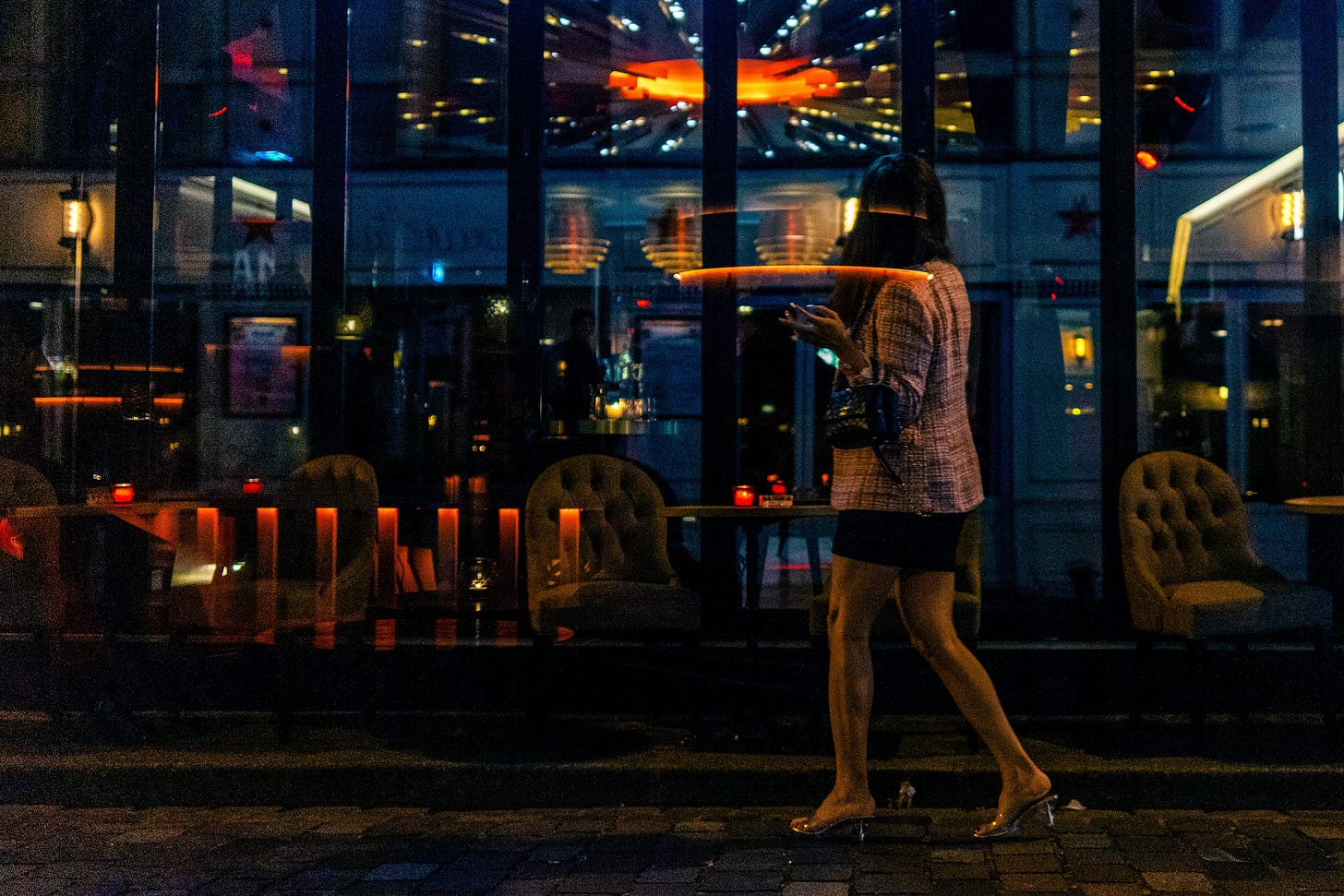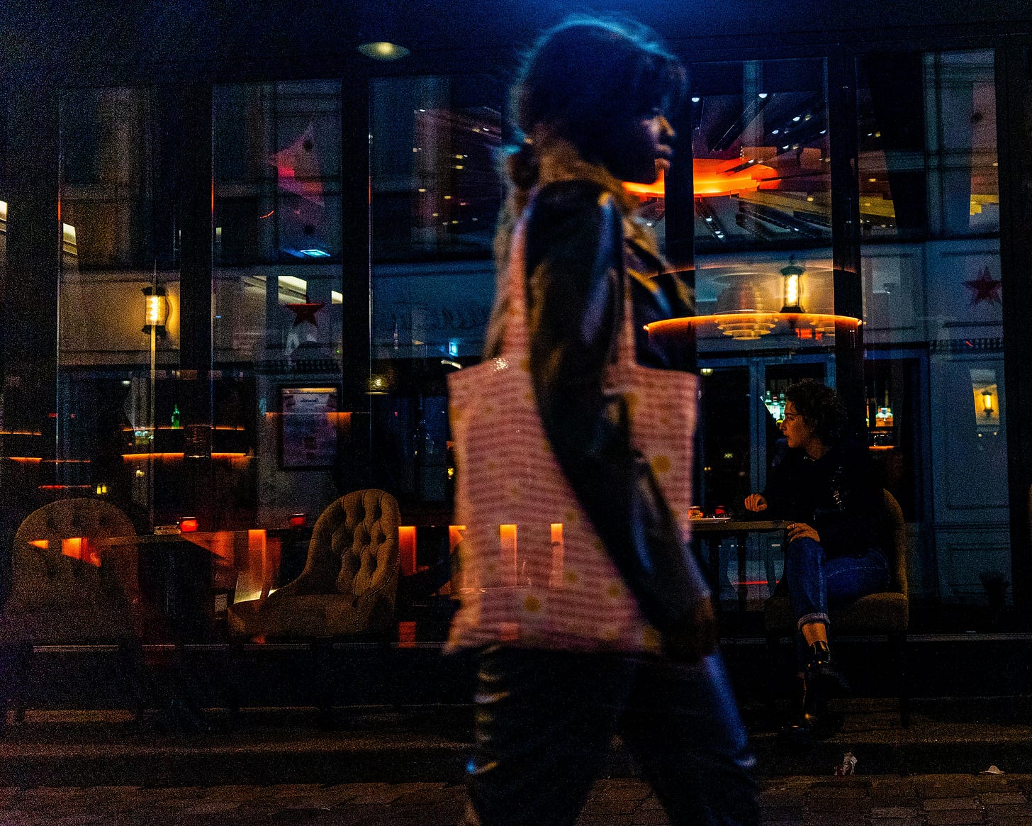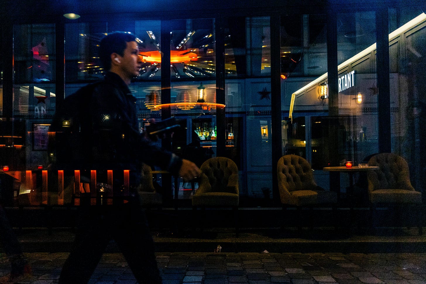 Photographing reflections means accepting that you can’t control the image. You have to watch for the moment when elements align: a passerby crossing at just the right spot, a car whose headlights suddenly reveal the hidden geometry of the scene.