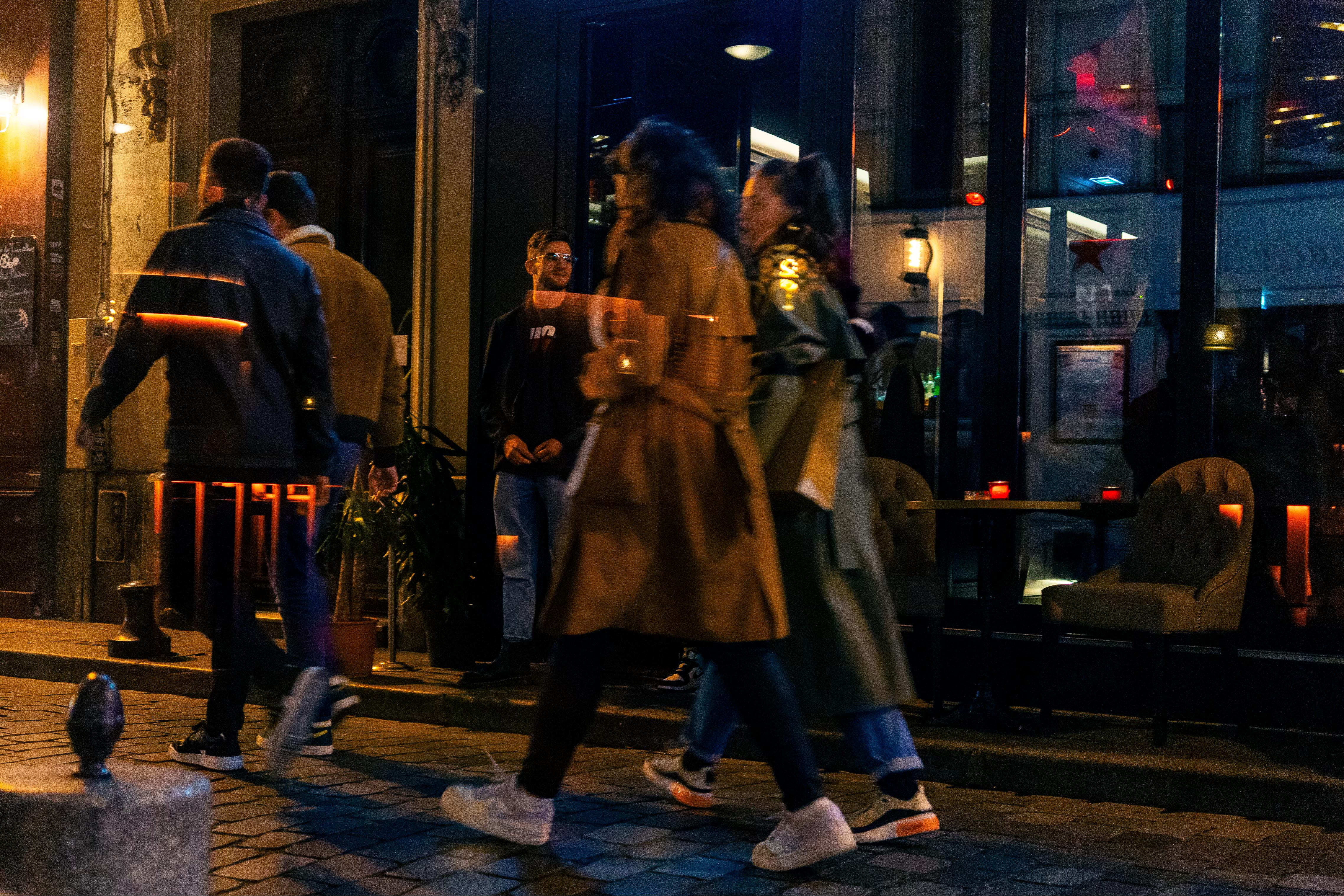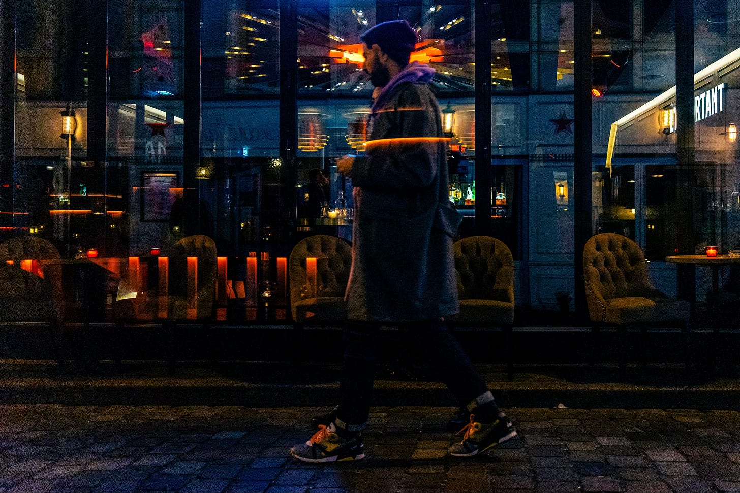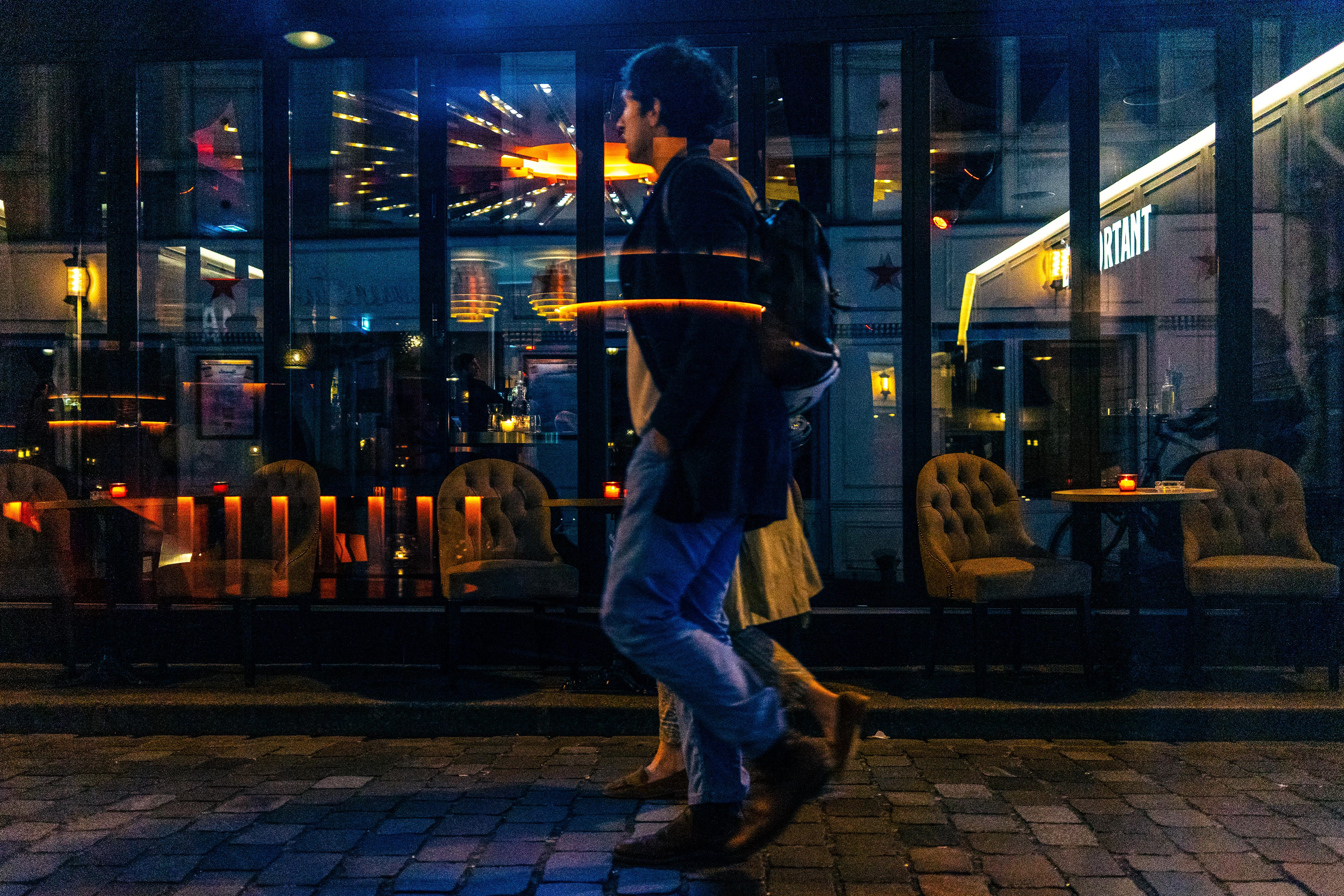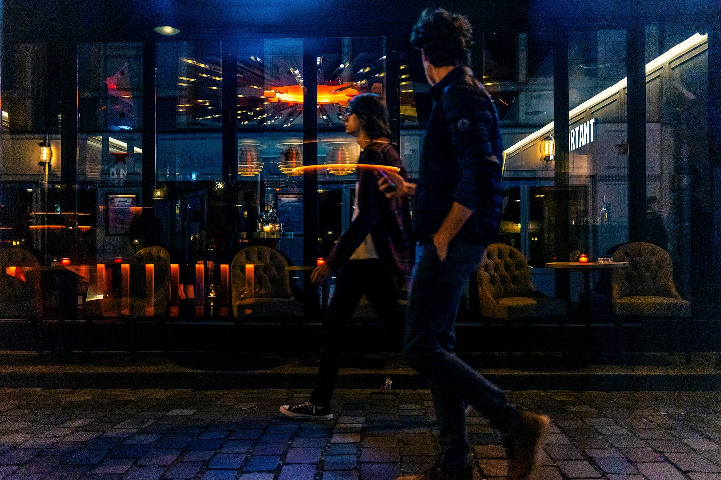 Photographing reflections means accepting that you can’t control the image. You have to watch for the moment when elements align: a passerby crossing at just the right spot, a car whose headlights suddenly reveal the hidden geometry of the scene.